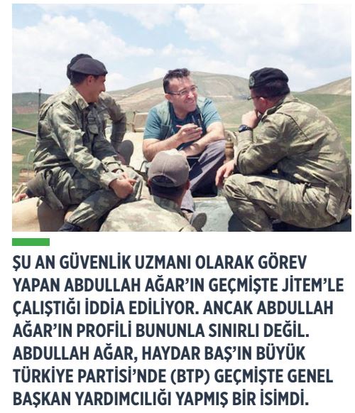 Şu an güvenlik uzmanı olarak görev yapan Abdullah Ağar’ın geçmişte JİTEM’le çalıştığı iddia ediliyor. Ancak Abdullah Ağar’ın profili bununla sınırlı değil. Abdullah Ağar, Haydar Baş’ın Büyük Türkiye Partisi’nde (BTP) geçmişte genel başkan yardımcılığı yapmış bir isimdi.
