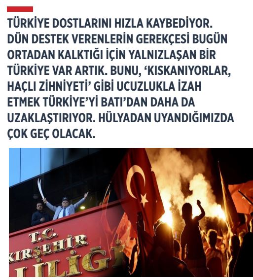 Türkiye dostlarını hızla kaybediyor. Dün destek verenlerin gerekçesi bugün ortadan kalktığı için yalnızlaşan bir Türkiye var artık. Bunu, ‘kıskanıyorlar, haçlı zihniyeti’ gibi ucuzlukla izah etmek Türkiye’yi Batı’dan daha da uzaklaştırıyor. Hülyadan uyandığımızda çok geç olacak.