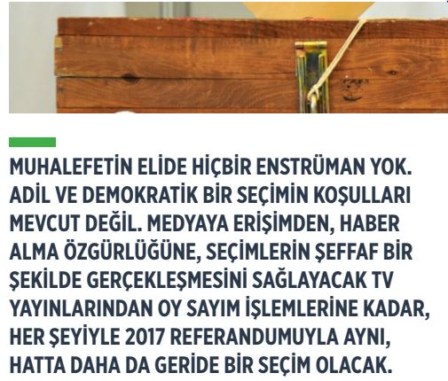 16 Nisan 2017 ile bugün arasında fiili rejim sönümlenerek anayasal düzene geri mi dönüldü? Yürütmenin (Saray diyelim!) yetki gaspı son mu buldu? Yüksek yargı organları ve diğer yargı kurumları (mahkemeler, yargıçlar, savcılar) bağımsızlaştı mı? YSK 2017 referandumundaki gibi hareket etmeyecek de, artık tarafsız ve adil şekilde mi değerlendirme yapacak? 2017 referandumunda yapılan manipülasyonun önümüzdeki seçimlerde tekrarlanmamasının garantisi yoksa Muharrem İnce’nin avukatlara yaptığı çağrı mıdır? Naif olmayalım, hatta evet, lütfen biraz ciddi olalım! Muhalefetin elide hiçbir enstrüman yok. Adil ve demokratik bir seçimin koşulları mevcut değil. Medyaya erişimden, haber alma özgürlüğüne, seçimlerin şeffaf bir şekilde gerçekleşmesini sağlayacak TV yayınlarından oy sayım işlemlerine kadar, her şeyiyle 2017 referandumuyla aynı, hatta daha da geride bir seçim olacak. İkinci tura kalması neredeyse kesin olan bu seçimlerde, 2017 ile aynı koşullarda, YSK hangi sonucu ilan edecek sanıyorsunuz? Zaten Anadolu Ajansı oy kullanma esnasında yayınlayacağı oy oranlarıyla YSK için uygun olan zemini oluşturacaktır. YSK ise kapalı kapılar ardında sahibinin sesine uygun hareket edecektir. Bir- bir buçuk puanlık farkla bile olsa, seçimin galibi Erdoğan olarak ilan edilirse, muhalefet ne yapacak? İtiraz edenlerin “FETÖ’cü provokatörler” ve “dış odakların güdümünde olan teröristler” olarak ilan edilmesinin ardından, polis ve jandarma gücüyle “asayişin sağlanması” – kitlesel tutuklamalar, asimetrik polis şiddeti vs. – amacıyla sahaya sürülmesi sonrasında ne olacak?