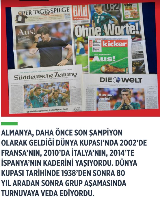 Rusya’ya grup aşamasında veda edecek takım olarak Arjantin önplana çıkmıştı. İlk maçında İzlanda ile berabere kalıp Hırvatistan’a yenilen Arjantin son maçında Nijerya’yı yenerek grupta ikinci olmayı başardı. Beklenti Arjantin’in evine dönmesiydi ama bunu Almanlar başardı. Hem de grupta Güney Kore’nin bile gerisinde kalıp, 4. olarak. Bu hezimetin büyük artçı sarsıntıları olacaktır. Löw’ün kadro seçimindeki yanlışlar koltuğunu kaybetmeye kadar gidecektir. Kupada bekleneni veremeyen Timo Werner, Mesut Özil, Sami Khedira ve Thomas Müller gibi yıldızların varlığı tartışılacaktır. Önümüzdeki günlerde Almanya cephesinden sarsıcı haberler peşpeşe gelecektir. Artık futbol Almanlar’ın sonunda kaybettiği bir oyunun adı.