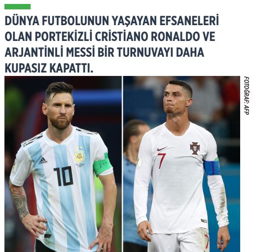 Dünya futbolunun yaşayan efsaneleri olan Portekizli Cristiano Ronaldo ve Arjantinli Messi bir turnuvayı daha kupasız kapattı. Son Avrupa şampiyonu unvanıyla Rusya’ya gelen Portekiz, son 16 turunda Uruguay’a elenerek evine döndü. Ronaldo’nun Dünya Kupası hayali gerçekleşmezken, turnuvada 4 kez fileleri havalandıran 33 yaşındaki Ronaldo, milli maçlardaki toplam gol sayısını 85’e çıkararak 84 kez ağları sarsan Macar efsanesi Ferenc Puskas’ı geçti. Avrupa’daki milli takımlar dikkate alındığında en golcü oyuncu konumuna gelen Ronaldo, dünya genelinde ise 109 gole sahip İranlı Ali Daei’nin ardından ikinci sıraya yükseldi. Arjantinli Messi ise yine bir uluslararası turnuvayı kupasız kapattı. Gruptan Nijerya karşısında son dakikalarda gelen golle çıkabilen Messi’li Tangocular, son 16 turunda Fransa’ya 4-3 yenilerek elenmekten kurtulamadı.