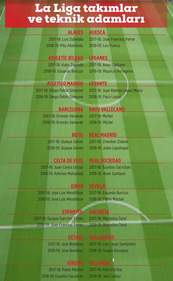 İspanya La Liga’da mücadele eden 20 takımdan 13’ü sezona yeni teknik adamla giriyor. Barcelona ve Atletico Madrid aynı teknik adamlarla yoluna devam ederken, sürpriz değişimin adresi Real Madrid olmuştu.