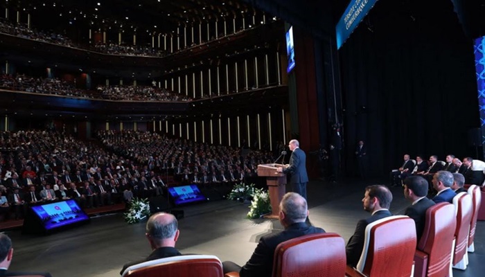 Sahnenin arkasında dev ekran, kürsüde Erdoğan ve arkasında koltuklarda oturan bakanlar… Yan yana oturmuş bakanların hepsi.