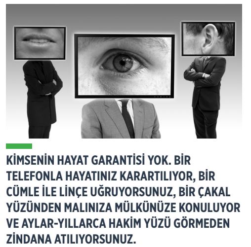 Kimsenin hayat garantisi yok. Bir telefonla hayatınız karartılıyor, bir cümle ile linçe uğruyorsunuz, bir çakal yüzünden malınıza mülkünüze konuluyor ve aylar-yıllarca hakim yüzü görmeden zindana atılıyorsunuz. Eşiniz, dostunuzu esir alınıyor. Hoş, hakim karşısına çıksa ne olacak? Adalet çoktan yerin yüz kat dibine gömüldü.
