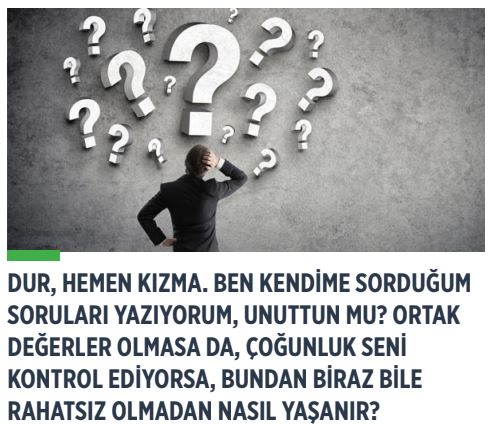 Ortak değerlerimiz yok bizim. O zaman biz var mıdır diye sormayalım mı? İlkelerimiz mi? Var tabi, de amalı fakatlıdır! Hukuk, kazananın hukuku! Kazanan kim? Güçlü olan mı, iyi hile yapan mı? İyi hile yapan en güçlüdür. O zaman sorunun yanıtı da verildi. Etrafın ne dediği, senin ne düşündüğünden daima önemliyse, sen var mısın gerçekten? Yok olmak, eğer sadece toprak olmaksa, ruhun baki diye inanmaktaysan, o ruhu ruh kılan tekillik, başkalarından ayıklanmadan nasıl var olacak? Dur, hemen kızma. Ben kendime sorduğum soruları yazıyorum, unuttun mu? Ortak değerler olmasa da, çoğunluk seni kontrol ediyorsa, bundan biraz bile rahatsız olmadan nasıl yaşanır? Bunu cidden bilemiyorum. Ortak değerlerin inşası için önce bireysel olarak kendi değerlerimizin olması lazım. Bunları sana biri veremez güzel kardeşim. Sen edineceksin, edinmelisin. Sadece adın soyadın değildir seni ayıran diğerlerinden. Sen ne düşünüyorsun, sen kendini tanıyor musun? Tanış, tavsiyem sana, kendinle. Önce neler senin değerinmiş bir gör. Sonra bu değerleri başkaları için de “kutsal” ilan et. Yani kendine istediğini, ötekileştirmeden kimseyi, başkalarına da hak gör. İşte şimdi insan oldun.