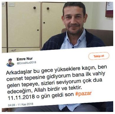 “Arkadaşlar dün gece sabaha kadar cennet tepesinde dualarıma karşılık veren Allah’ım bize ikinci şans verdi. Yeni gelen vahiy de 12.12.2018 e kadar gemi yapmamı söylüyor. Büyük tufan kopacak küresel bir kasırga ile gelecek ve bu son şansımız bana inandığınız için sizleri seviyorum…”