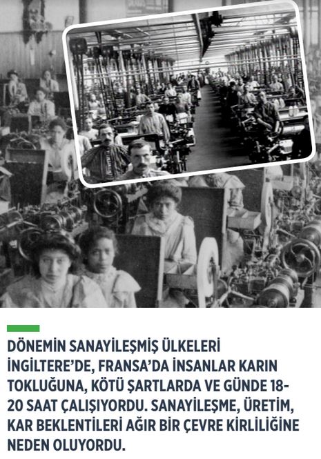 Sanayi devrimi sonrası hızla sanayileşen batıda yeni bir sınıf, işçi sınıfı ortaya çıktı. bu dönemde üretim, sanayi, fabrika bacaları kutsanıyor. Üretilen mallar dünyaya satılıyor, sermaye, para, kaynaklar batıya akıyordu. Bu yeni üretim tarzı toprağa dayalı zenginlikten ayrı sanayicilerde, bankerlerden, tüccarlardan oluşan yeni zengin türü doğurdu. Kapitalizm olarak adlandırılan bu sistem emeğiyle geçinenleri istismar ediyor, onların ürettiği artık değerin sermayedarlara akmasına neden oluyordu. Çifti, küçük üretici tüccarlar karşısında eziliyordu. Büyük paralara hükmeden sanayiciler, tefeciler, bankalar emeğiyle geçinen küçük üreticileri, işçileri, zanaatkarları, köylüleri sömürüyordu. Dönemin sanayileşmiş ülkeleri İngiltere’de, Fransa’da insanlar karın tokluğuna, kötü şartlarda ve günde 18-20 saat çalışıyordu. İşçiler bugün Çin’de var olan fabrika yatakhanelere rahmet okutacak gayrı insani ortamlarda barınıyorlardı. Sanayileşme, üretim, kar beklentileri ağır bir çevre kirliliğine neden oluyordu. 1900’lerin başında Londra’da hava kirliliğinden yığınla insan ölüyordu. Sosyal ve sendikal haklar, azami çalışma saati, izin, tatil vb bilinmiyordu. Sermaye, fabrika, para değerliydi ama emek değersizdi, ucuzdu; insanlar eziliyordu.