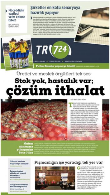 İktidar temsilcileri aylardır soğanda stokçuluk olduğunu, soğan lobilerinin piyasayı manipüle ettiğini iddia ediyor. Tr724 manşetten verdiği haberde, ‘stokçuluk’ olmadığını, soğanın üretiminde azalma olduğunu, küf hastalığı nedeniyle arzın düştüğünü bunun da fiyatların artmasına neden olduğunu ortaya koymuştu.