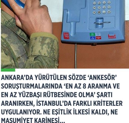 Ankesör soruşturmasında ortaya çıkan gerçekler, Türkiye’de hukukun ne hale geldiğini de gözler önüne seriyor. Ankara’da yürütülen sözde ‘ankesör’ (kontörlü telefon) soruşturmalarında ‘en az 8 aranma ve en az yüzbaşı rütbesinde olma’ şartı aranırken, İstanbul’da farklı kriterler uygulanıyor. Ne eşitlik ilkesi kaldı, ne masumiyet karinesi… İnsanların özgürlüğü, hiçbir hukuki temeli olmayan suçlamalarla ellerinden alınıyor.