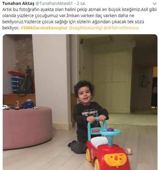 “SMA ilacımızı verin. Ne onlar ne de aileleri olan bizler üzülmeyelim. Artık koşarken, oynarken, ayakta dururken videolarını çekip atalım. Lütfen ilacımızı verin.”