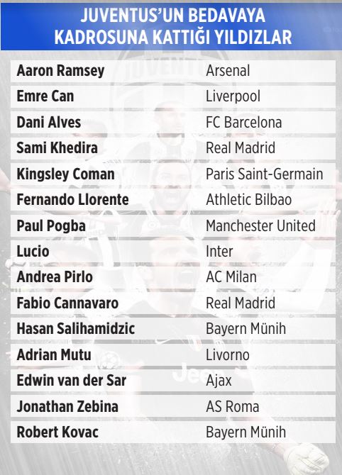 Mevcut Juventus kadrosunda bedava gelen iki oyuncu bulunuyor. Biri Real Madrid’den kadroya katılan Sami Khedira diğeri Liverpool’dan gelen Türk asıllı Emre Can. Her iki oyuncuda Juventus’un kadrosunun önemli isimleri arasında yer alıyor. Sezon sonunda bu isimlere Aaron Ramsey eklenecek.