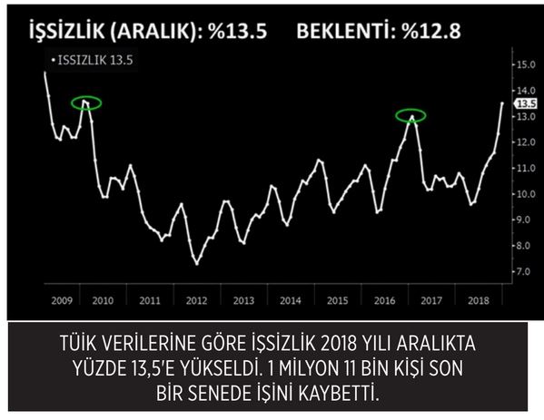 15 ve daha yukarı yaştakilerde işsiz sayısı, geçen yılın aralık ayında bir önceki yılın aynı ayına göre 1 milyon 11 bin kişi artarak 4 milyon 302 bin kişiye çıktı. Aynı dönemde işsizlik oranı yüzde 3,1 yükselerek yüzde 13,5’e fırladı.