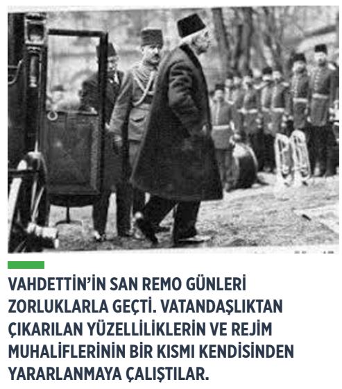 Vahdettin’in San Remo günleri zorluklarla geçti. Vatandaşlıktan çıkarılan Yüzelliliklerin ve rejim muhaliflerinin bir kısmı kendisinden yararlanmaya çalıştılar. Bu girişimler Vahdettin’in zaten az olan parasının harcanmasına yol açtığı gibi bir kısmını da eski kayınbiraderi Hademe-i Hassa Kumandanı Çerkez Zeki Bey kumar masalarında bitirdi.
