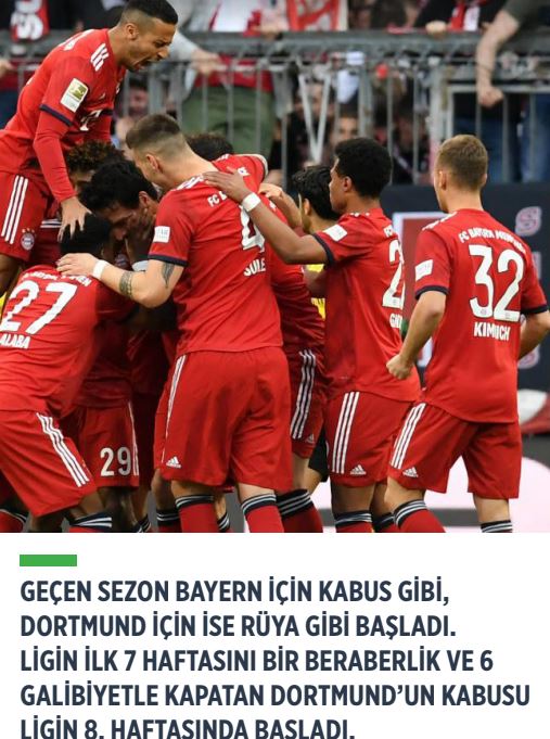 Geçen sezon Bayern için kabus gibi, Dortmund için ise rüya gibi başladı. Ligin ilk 7 haftasını bir beraberlik ve 6 galibiyetle kapatan Dortmund’un kabusu ligin 8. haftasında başladı. İnanması güç bir kötü performans ortaya koydu. 8. haftadan itibaren oynadığı 8 maçta 5 yenilgi ve 3 beraberlik aldı, galibiyete hasret kaldı. Ligin ilk devresi bitmeden şampiyonluk yarışında havlu atan bir Dortmund vardı. Nitekim sezonu 4. sırada, şampiyon Bayern’in 29 puan gerisinde tamamladı.