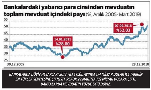 Enflasyondan kaçan dolar alıyor. 31 Aralık 2018 tarihi itibarıyla 148 milyar dolar olan döviz tevdiat hesapları 29 Mart’ta 182 milyar dolar mertebesine yükseldi.